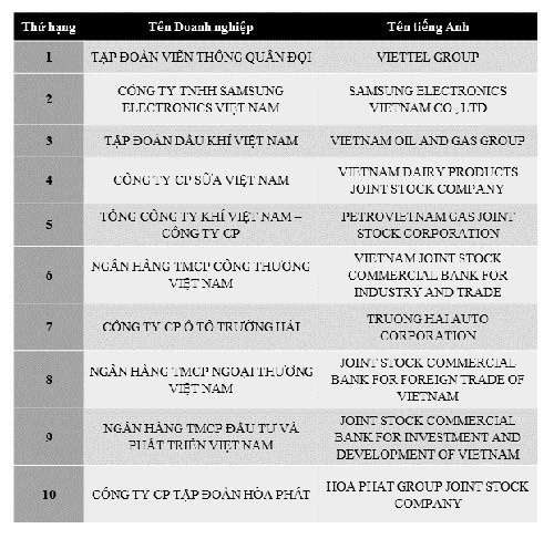 Theo công bố này, Top 10 doanh nghiệp nộp thuế nhiều nhất là những doanh nghiệp thuộc lĩnh vực sản xuất - kinh doanh và tài chính, viễn thông. Trong hệ thống ngân hàng, VietinBank một lần nữa góp mặt và là ngân hàng nhiều năm liên tiếp nằm trong Top 10 doanh nộp thuế lớn nhất Việt Nam.