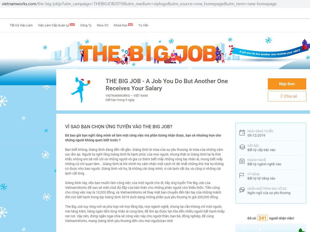 Là một trong những hoạt động nằm trong chính sách thực hiện trách nhiệm xã hội của tập đoàn Navigos Group, chiến dịch “The Big Job” phù hợp với tất cả mọi người, bất kể ngành nghề, độ tuổi, cấp bậc. Bằng cách tham gia ứng tuyển “The Big Job” trên trang web VietnamWorks trong thời gian từ ngày 9/12 đến 20/12/2019, người tìm việc đã cùng chung tay với VietnamWorks mang những món quà yêu thương đến với những số phận kém may mắn.