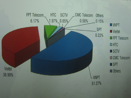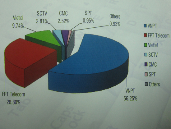 Về thị phần của các doanh nghiệp cung cấp dịch vụ truy nhập Internet băng rộng (cả cố định và di động), trong số 8 doanh nghiệp đang triển khai kinh doanh dịch vụ này, năm 2013, thị phần của VNPT lớn nhất, chiếm tới trên 51,2%; tiếp đó là Viettel với số thuê bao chiếm gần 39%.