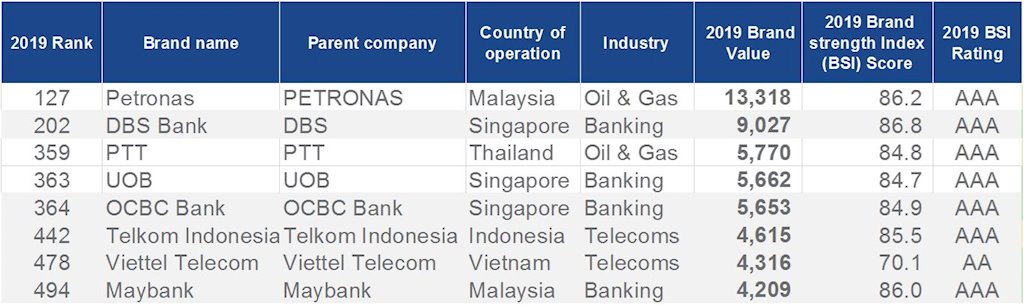 Trong tổng số khoảng 5.000 doanh nghiệp trên toàn thế giới, với xấp xỉ 500 doanh nghiệp Đông Nam Á được đưa vào đánh giá, chỉ có 8 thương hiệu ASEAN lọt vào danh sách bao gồm 3 lĩnh vực viễn thông, dầu khí và ngân hàng.