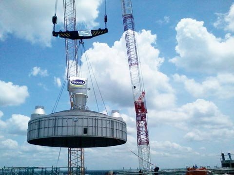| 11giờ sáng ngày 30.5.2012, đỉnh tháp sấy sữa bột số 2 của nhà máy sữa bột Dielac 2 Vinamilk bắt đầu được cẩu, và chuẩn bị rời khỏi mặt đất (đỉnh tháp sấy số 1 đã được cẩu thành công vào ngày 24.5.2012) |