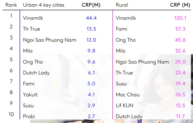 Trong hơn 1 thập kỷ của báo cáo Dấu chân thương hiệu, Vinamilk luôn giữ vững vị trí cao nhất trong bảng xếp hạng Top 10 Thương hiệu sữa và sản phẩm từ sữa được người tiêu dùng Việt Nam chọn mua nhiều nhất với điểm CRP (Customer Reach Point - Điểm tiếp cận người tiêu dùng) vượt xa các thương hiệu khác. Trong bảng Top 10 Thương hiệu sữa và sản phẩm từ sữa được chọn mua nhiều nhất còn có sự xuất hiện của 2 thương hiệu khác là Susu và Probi, thuộc ngành hàng sữa chua - một trong những ngành hàng chủ lực của Vinamilk. Như vậy, trong 10 thương hiệu tiêu biểu nhất ngành sữa năm 2022 thì các tên tuổi thuộc Vinamilk đã chiếm tới 5 vị trí.