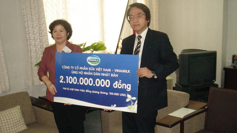 | Bà Mai Kiều Liên - Chủ tịch HĐQT-Tổng Giám Đốc Vinamilk đang trao cho Ông Hida Harumistu, Tổng Lãnh sự quán Nhật Bản tại TP.HCM số tiền mà CBCNV Vinamilk ủng hộ nhân dân Nhật Bản. |