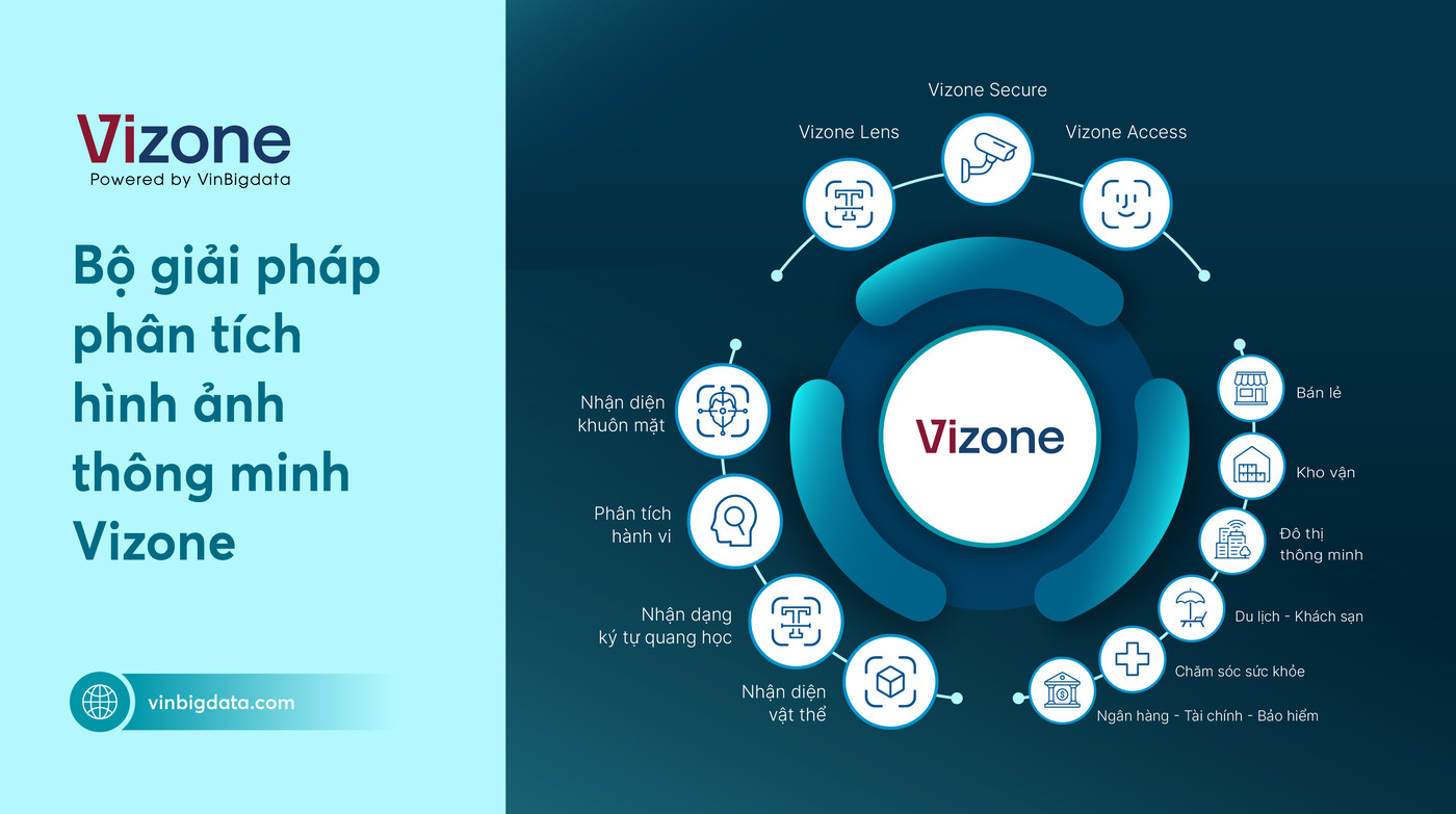 Bộ giải pháp phân tích hình ảnh thông minh ứng dụng công nghệ trí tuệ nhân tạo (AI) và thị giác máy tính Vizone của VinBigdata bao gồm các sản phẩm: Vizone Secure - Giải pháp giám sát an ninh, an toàn dựa trên phân tích video thông minh; Vizone Access - Giải pháp kiểm soát ra vào bằng khuôn mặt và Vizone Lens - Giải pháp định danh khách hàng điện tử và nhận dạng tài liệu.