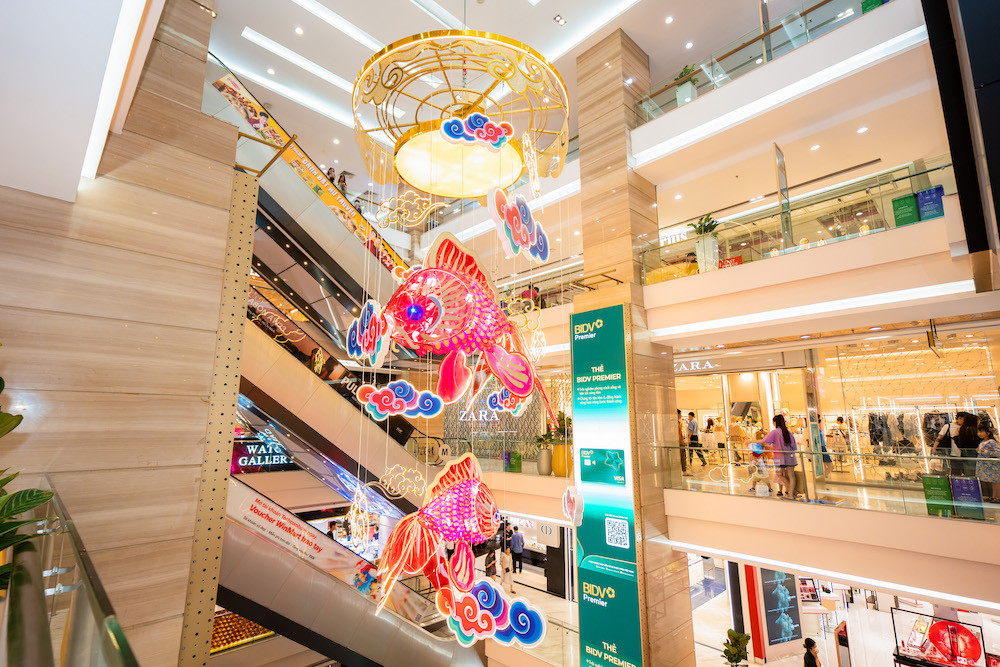Sự “biến hoá” cũng trở nên khác biệt các TTTM lớn của Vincom. Nếu Vincom Mega Mall Ocean Park “hóa thân” thành cá chép trông trăng khổng lồ lấp lánh ánh sáng huyền ảo thì Vincom Mega Mall Times City lại tỏa sáng với hình ảnh đèn kéo quân nổi bật giữa không gian múa rối nước truyền thống. Bên trong đèn kéo quân khổng lồ là màn trình diễn ánh sáng các họa tiết dân gian đương đại mang đến hiệu ứng thị giác ấn tượng cho khách hàng.