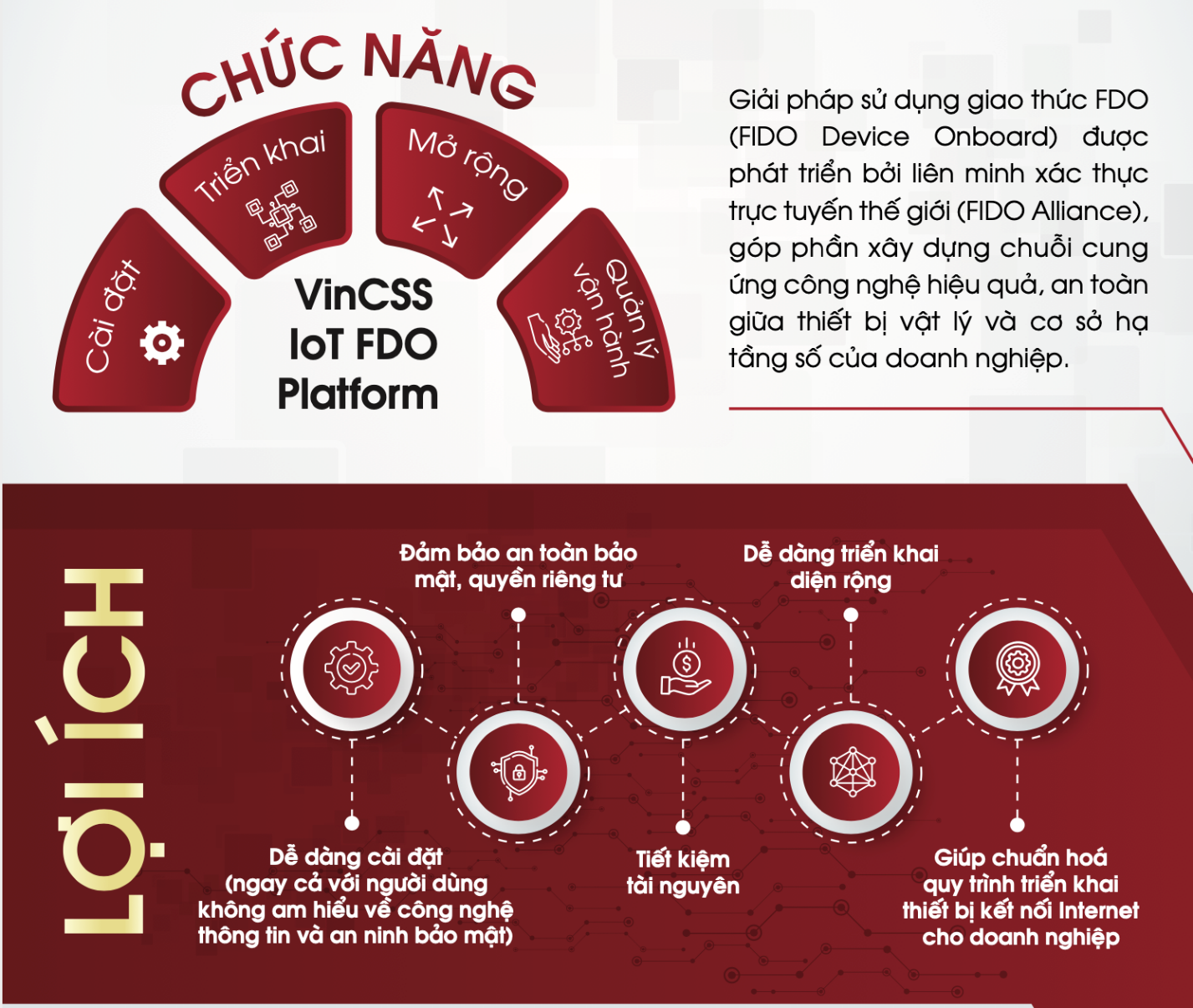 Chưa đầy một năm kể từ khi giao thức FDO ra đời, VinCSS, một startup đến từ Việt Nam thuộc Tập đoàn Vingroup đã phát triển hoàn chỉnh và sẵn sàng khai thác thương mại nền tảng VinCSS IoT FDO theo tiêu chuẩn FIDO Device Onboarding giúp doanh nghiệp tối ưu hiệu quả triển khai an toàn cho thiết bị IoT.