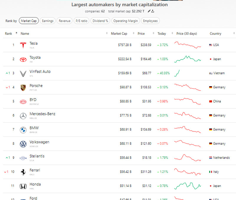 Với mức giá mới thiết lập, vốn hóa của VinFast đang dần tiệm cận hãng xe hơi lớn thứ 2 thế giới Toyota. Hãng xe của Nhật có vốn hóa tính tới 25/8 là 222 tỷ USD. Trong khi đó, hãng Tesla của Mỹ có vốn hóa 757 tỷ USD.