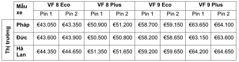 Các mẫu xe VF 8 và VF 9 của VinFast dự kiến sẽ có mặt tại châu Âu trong nửa cuối 2022 với 2 phiên bản Eco và Plus, tương ứng với 2 lựa chọn pin với mức giá cụ thể ở mỗi thị trường như sau: