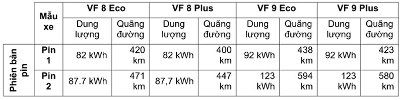Các phiên bản pin của VF 8 và VF 9 có dung lượng khả dụng và phạm vi quãng đường cụ thể như sau (theo tiêu chuẩn WLTP):