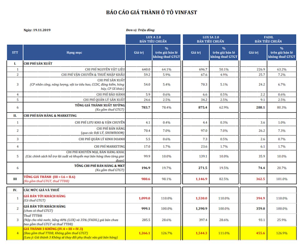Phía VinFast lần đầu tiên công khai bảng tính chi tiết giá thành sản xuất và các khoản thuế phí của 3 mẫu xe ô tô VinFast. Theo đó, chiếc Lux A2.0 bản tiêu chuẩn ở thời điểm hiện tại có giá vốn là 980,6 triệu đồng. Trong đó, 783,7 triệu đồng là giá thành sản xuất, bao gồm các chi phí: nguyên vật liệu, vận chuyển, thuế nhập khẩu, sản xuất, bảo hành, lưu kho, bán hàng, quản lý…Tuy nhiên, xe phải gánh thêm 40% thuế tiêu thụ đặc biệt (tương đương 285,5 triệu đồng) và 10% thuế VAT (126,6 triệu đồng).