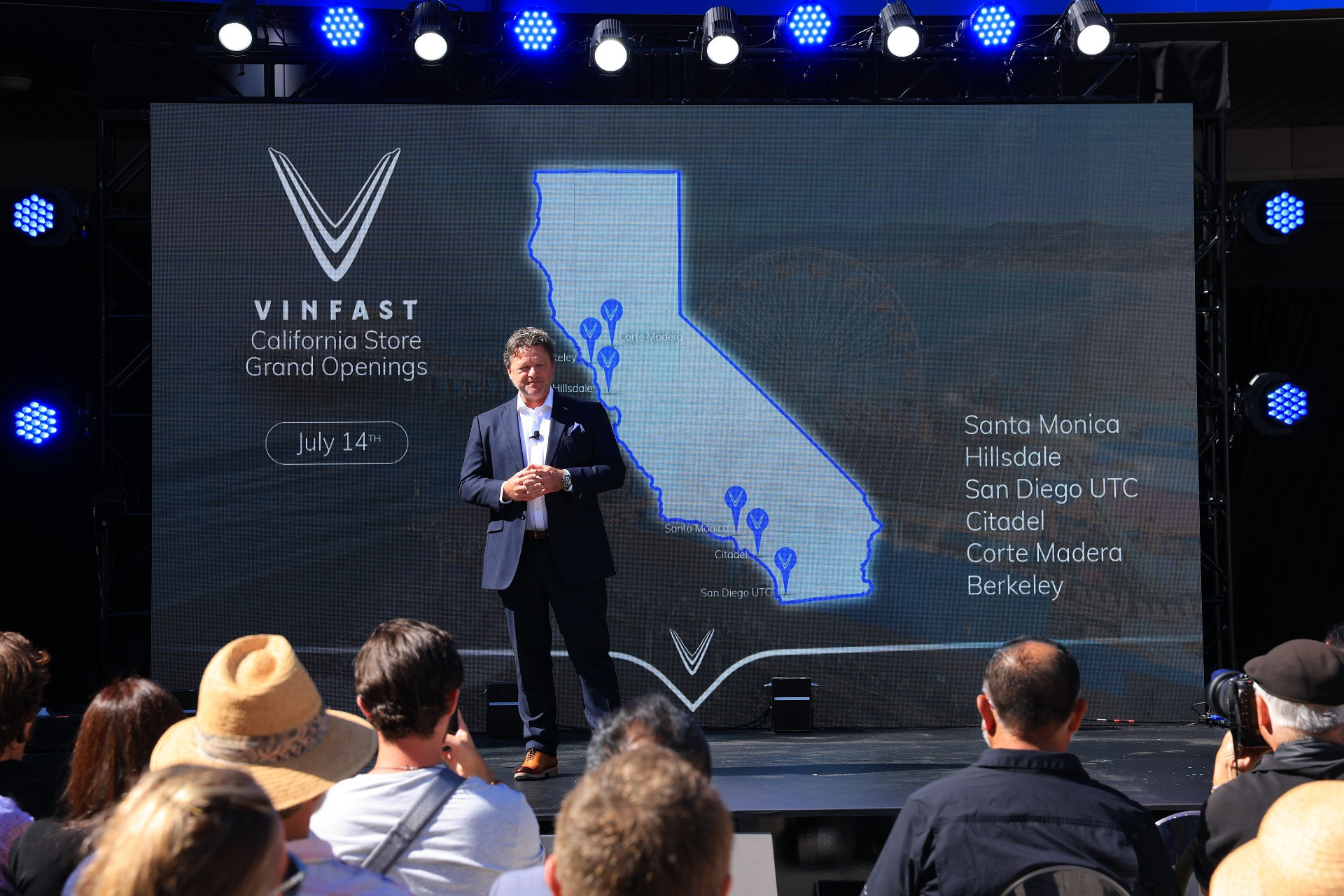 Danh sách các địa điểm Khai trương VinFast Store tại California: VinFast Santa Monica: 395 Santa Monica Place - Center Court, Santa Monica, CA (mở cửa đón khách từ 5 giờ chiều). VinFast Hillsdale: TTTM Hillsdale, 52 31st Ave, San Mateo, CA. VinFast San Diego UTC: Westfield UTC, 4545 La Jolla Village Drive, San Diego, CA. VinFast Citadel: Citadel City: 100 Citadel Drive, Commerce, CA. VinFast Berkeley: Fourth Street Shops, 1733 4th Street, Berkeley, CA. VinFast Corte Madera: The Village, 1618 Redwood Hwy, Corte Madera, CA. |