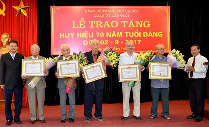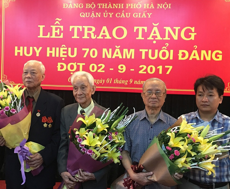 Trưởng Ban Tổ chức Thành ủy Hà Nội Vũ Đức Bảo (ngoài cùng bên trái) trao Huy hiệu 70 năm tuổi Đảng cho đảng viên lão thành Trần Doãn Khánh (thứ 4 từ trái sang) cùng các đảng viên lão thành Quận ủy Cầu Giấy.