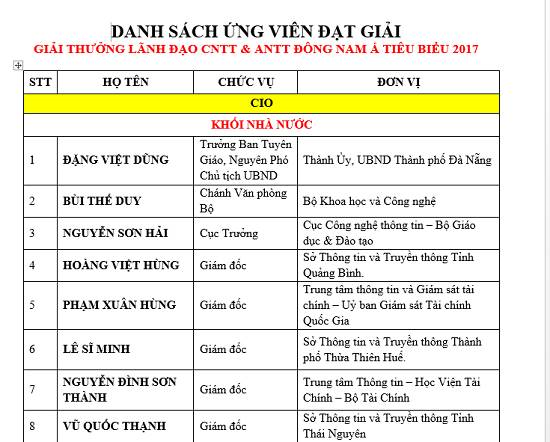 Lễ trao giải và Họp báo giải thưởng ASEAN CIO/CSO Awards 2017 vinh danh 26 Lãnh đạo CNTT & ANTT tiêu biểu tại Việt Nam và khu vực Đông Nam Á, gồm 9 CIO khối Nhà nước từ 4 Bộ, 3 Sở, Ngành, 1 UBND (thành phố Đà Nẵng) và 1 Ủy ban (Ủy ban Giám sát Tài chính); 5 CIO Khối Doanh nghiệp từ 2 doanh nghiệp nhà nước, 2 doanh nghiệp tư nhân, 1 doanh nghiệp có vốn nước ngoài; 5 CIO Khối Nước ngoài gồm 4 doanh nghiệp Tài chính – Ngân hàng và 1 đơn vị Viễn thông; cùng 7 CSO từ 5 đơn vị Bộ, Ngành TW và 2 đơn vị khối Doanh nghiệp nhóm Ngân hàng – Tài chính.