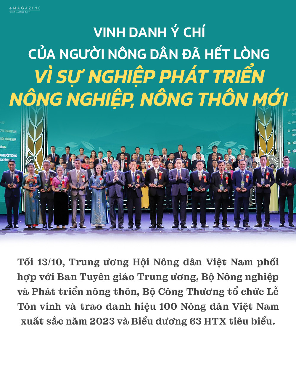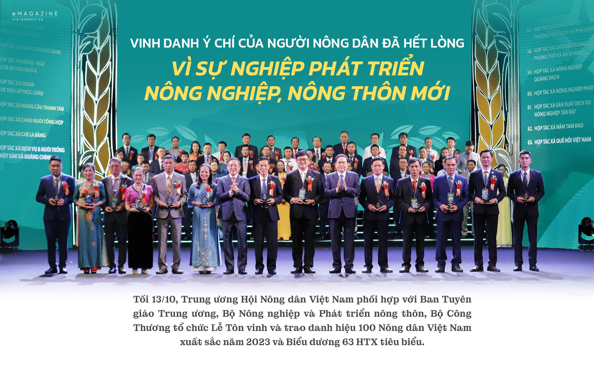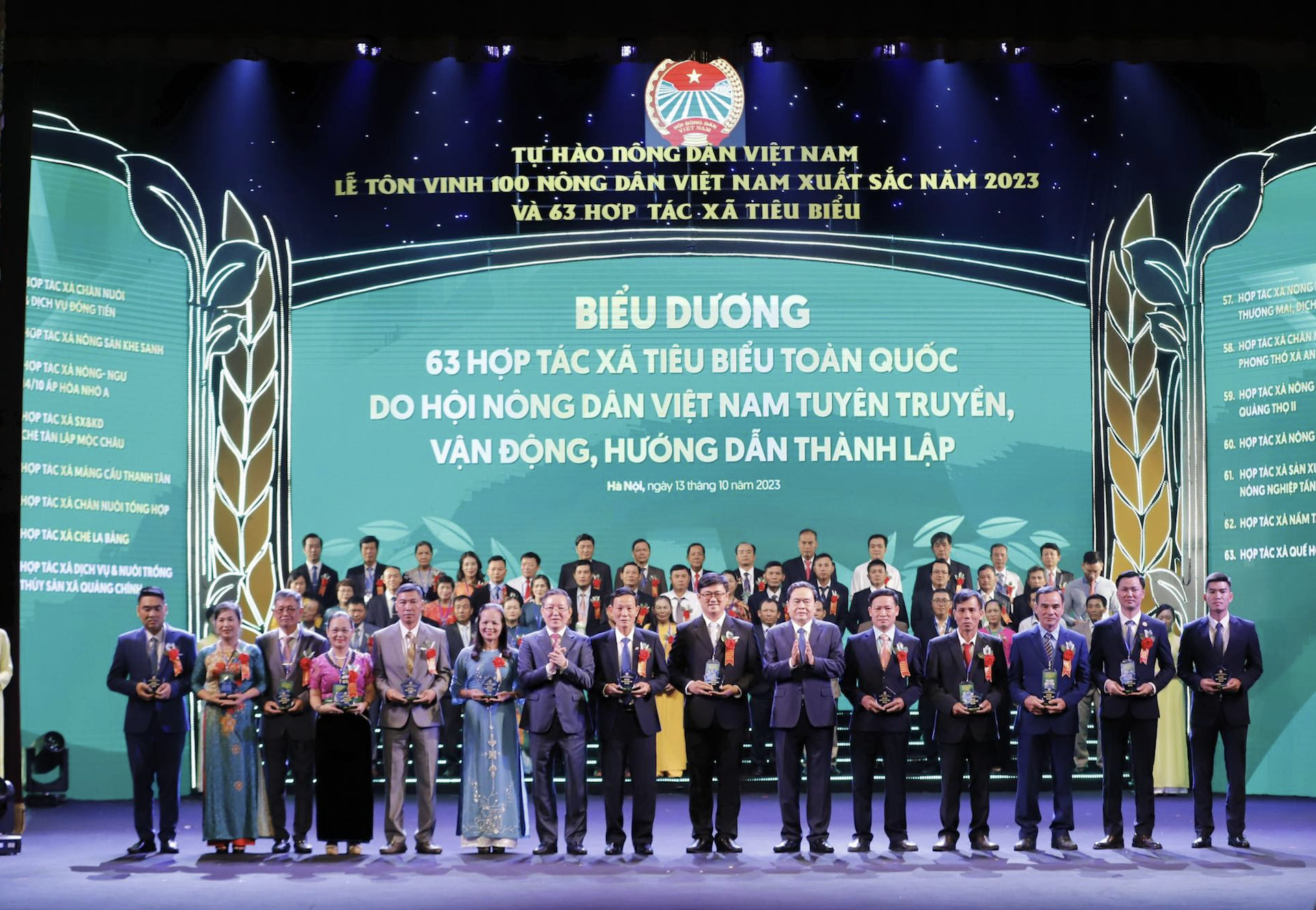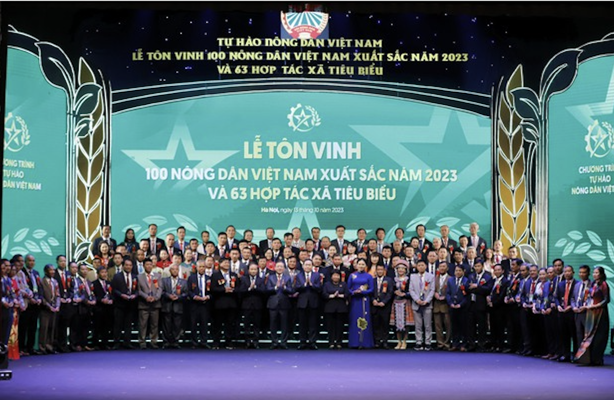 Tối 13/10, Trung ương Hội Nông dân Việt Nam đã chủ trì, phối hợp với Ban Tuyên giáo Trung ương, Bộ Nông nghiệp và Phát triển nông thôn, Bộ Công Thương tổ chức Lễ Tôn vinh và trao danh hiệu 100 Nông dân Việt Nam xuất sắc năm 2023 và Biểu dương 63 hợp tác xã tiêu biểu toàn quốc.
