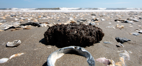 Một tảng hắc ín trôi dạt vào bờ biển ở cảng Fourchon, Louisiana ngày 13/04. Hắc ín và dầu loang vẫn còn rất nhiều ở bờ biển bang Louisiana một năm kể từ sau vụ nổ giàn khoan Deepwater Horizon ngày 20/04/2010.