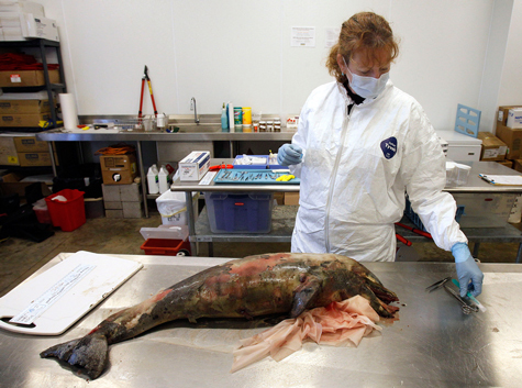 Bác sĩ thú y Wendy Hatchett ở Viện nghiên cứu động vật biển có vú chuẩn bị lấy mẫu da của một con cá heo mũi chai đã chết được tìm thấy ở vùng đảo Ono, Alabama và sau đó mang tới phòng thí nghiệm ở Gulfport, Mississippi. Theo cơ quan quản lý khí quyển và đại dương quốc gia của Mỹ (NOOA), kể từ tháng 01/2011, đã có 155 chú cá heo mũi chai con hay cả những con đang có thai và các con cá voi nhỏ đã bị chết và sóng đánh dạt vào bờ - cao gấp 4 lần so với bình thường. Và một quan chức của NOOA cho rằng, dầu loang có thể là một nguyên nhân đã gây ra những cái chết này.