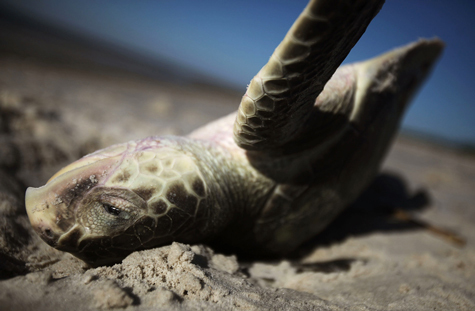 Xác chết của một cá thể rùa biển đang có nguy cơ tuyệt chủng trôi vào bờ biển ở Pass Christian, Mississippi ngày 16/04/2011. Theo cơ quan bảo tồn cuộc sống hoang dã quốc gia Hoa Kỳ, xác chết của những con rùa biển trôi dạt vào bờ biển ở Vịnh Mexico cao cấp 3 lần mức bình thường trong tháng ba.