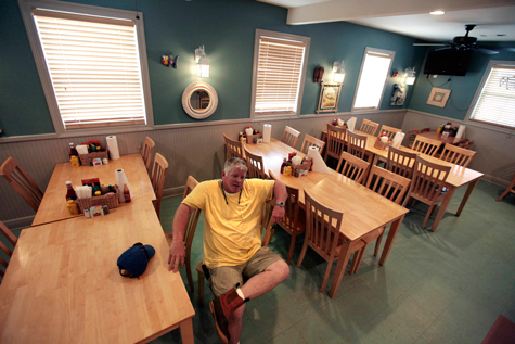 Melvin Barnes, chủ nhà hàng và chợ hải sản Cruz ở Vịnh St. Louis, Mississippi ngồi trong nhà hàng vắng vẻ của ông ngày 29/03/2011. Nguồn nước nhiễm dầu đã khiến lượng hải sản đánh bắt giảm đi, khách hàng xa rời các nhà hàng và từ chối ăn hải sản từ Vịnh Mexico. Barnes đã phải bán chiếc xe tải để lấy tiền mặt và đang chờ đợi khoản tiền đền bù.