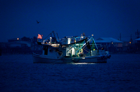 Một con tàu đánh cá đang neo trên biển ở đảo Grand Isle trước lúc mặt trời mọc. Ngành đánh bắt hải sản và du lịch ở đảo Grand Isle đã bị ảnh hưởng nghiêm trọng bởi tình trạng dầu loang.