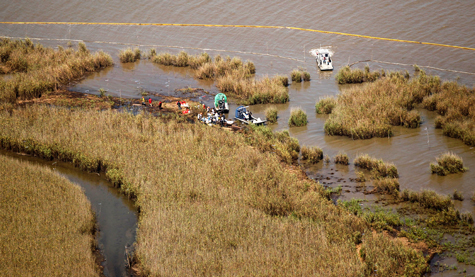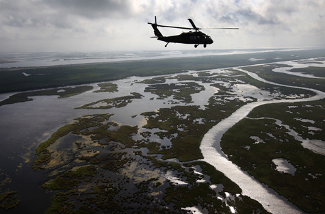 Chiếc máy bay trực thăng của lực lượng bảo vệ quốc gia bang Louisiana bay ngang qua vùng đầm lầy trên đường đến Middle Ground, Nam Louisiana hôm 19/4. Một năm sau thảm họa tràn dầu ở Vịnh Mexico, BP tuyên bố rằng hầu hết lượng dầu loang đã được thu hồi, tuy nhiên cơ quan quản lý ngành đánh bắt hải sản và cuộc sống hoang dã bang Louisiana cho biết, lượng dầu thu hồi được chỉ nằm ở bề mặt, trong khi dầu đã thấm vào đất, giết chết cây cỏ và về lâu dài sẽ ảnh hưởng đến hệ sinh thái của vùng đồng bằng này.
