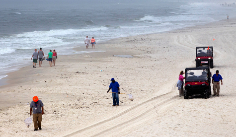 Những người tắm biển đi tản bộ dọc theo bờ, trong khi các công nhân dọn dẹp vẫn đang đi thu gom những miếng hắc ín. Một năm sau thảm họa, những tảng hắc ín lớn nhỏ vẫn trôi vào các bờ biển ở Vịnh Mexico.