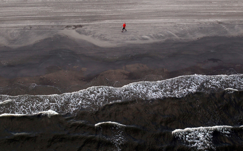 Một người phụ nữ bước trên bờ biển khi những con sóng từ Vịnh Mexico xô vào bờ trên hòn đảo Grand Isle ngày 13/04/2011. Cư dân nơi đây cho biết, dầu vẫn trôi vào bờ sau những cơn bão.
