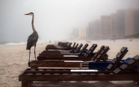 Một con cò đứng trên chiếc ghế ở bờ biển trên bãi biển Orange, Louisiana đúng môt năm sau ngày xảy ra thảm họa 20/4/2011.