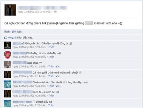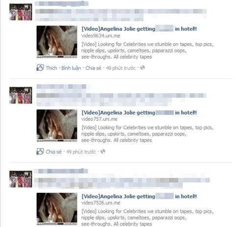 Bùng phát dữ dội trong thời gian gần đây, hàng nghìn tài khoản Facebook đang lây nhiễm loại virus tự động chia sẻ cảnh nóng với chủ đề “Angelina Jolie getting *** in hotel”. Thông tin được minh họa bằng từ ngữ và hình ảnh khêu gợi, nếu bạn click vào thì được dẫn tới một trang có giao diện giống hệt YouTube. Khi máy tính “dính chưởng”, virus liên tục spam trên tường nhà bạn, đồng thời tag những người nằm trong danh sách bạn bè. Chúng tạo nên không khí rất phản cảm và thành viên đành phải kiên nhẫn ngồi xóa từng bài viết lừa đảo này.