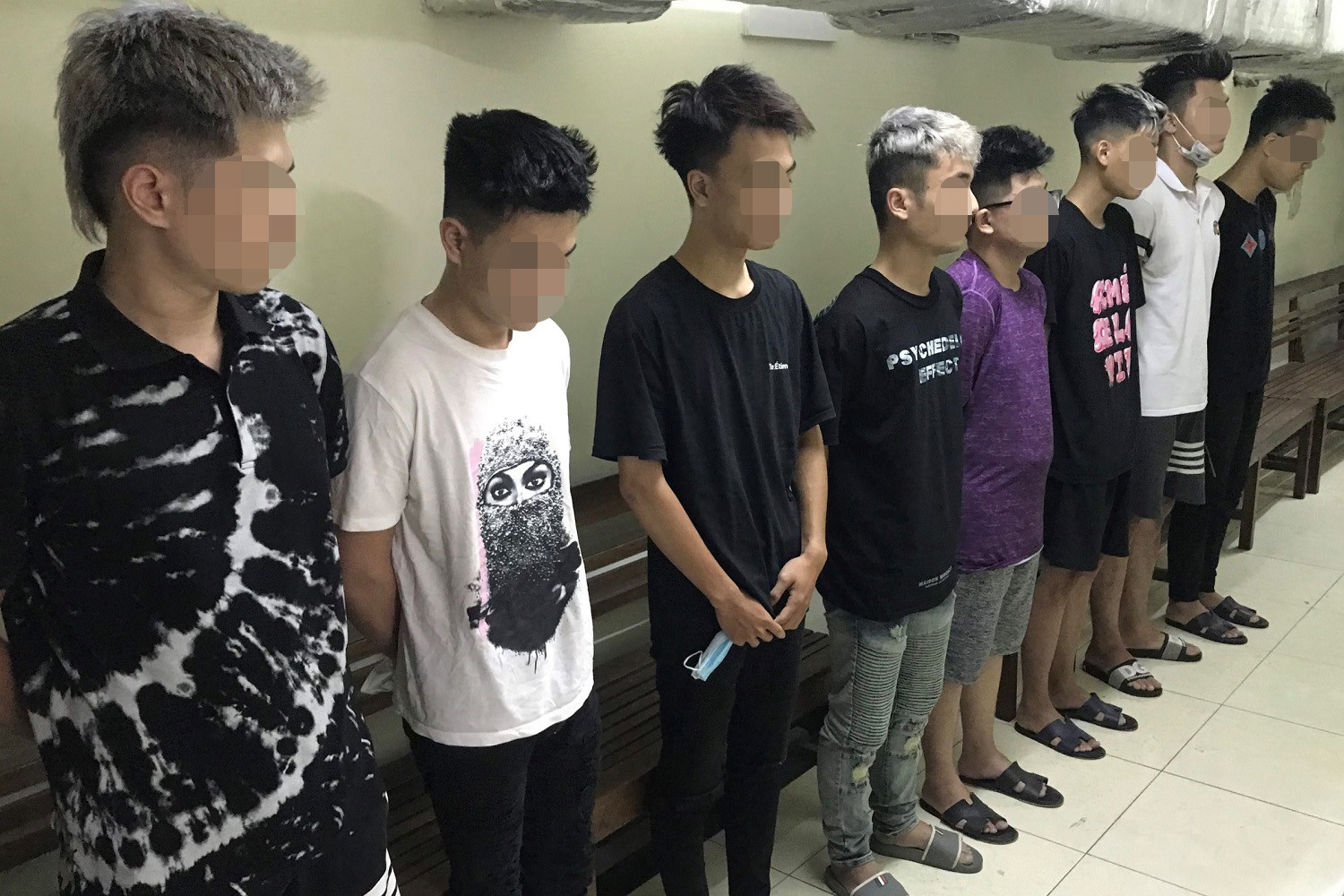 Các đối tượng bị tạm giữ gồm: Vũ Anh Tài (SN 2004), Bùi Xuân Bách (SN 2003), Dương Trung Đức (SN 2003), Phạm Minh Đức (SN 2003), Trần Vũ Tiến Đạt (SN 2004), Nguyễn Hải Long (SN 2004), Nguyễn Tài Đức (SN 2003) và Ngụy Hoàng L. (SN 2006), cùng trú tại Hà Nội.