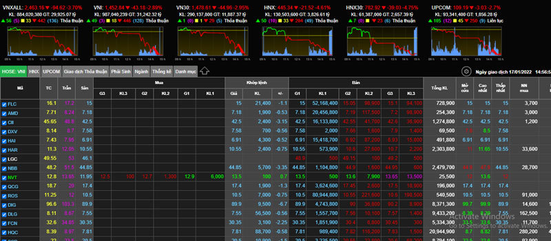 Kết thúc phiên giao dịch 17/1, VN-Index giảm 43,18 điểm xuống 1.452,84 điểm. HNX-Index giảm 21,52 điểm xuống 445,34 điểm. Upcom-Index giảm 3,17 điểm xuống 109,05 điểm. Thanh khoản tăng lên 37,8 điểm.