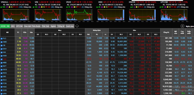 Chốt phiên chiều 18/1, VN-Index giảm 13,9 điểm xuống 1.438,94 điểm. HNX-Index giảm 24,13 điểm xuống 421,21 điểm. Upcom-Index giảm 1,89 điểm xuống 107,47 điểm. Thanh khoản đạt 26,7 nghìn tỷ đồng, trong đó trên sàn HOSE đạt 23 nghìn tỷ đồng.