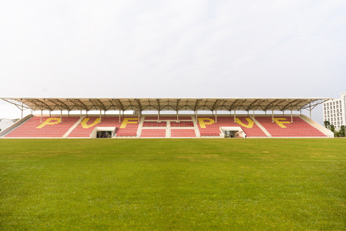Trong đó, hệ thống sân gồm 7 sân, với trọng tâm là sân thi đấu chính, quy mô 3.600 chỗ được đảm bảo những điều kiện thi đấu tốt nhất các giải đấu lớn và 06 sân tập kích thước tiêu chuẩn 11v11 với mặt cỏ do FIFA Quality Prom chứng nhận. Đặc biệt, để đảm bảo điều kiện luyện tập lý tưởng nhất, bên cạnh sân cỏ trong nhà đầu tiên tại Việt Nam, PVF còn được trang bị hệ thống phòng tập giả lập 360s và thiết bị PlayerTek theo dõi hiệu suất thi đấu của cầu thủ hiện đại đầu tiên tại châu Á.