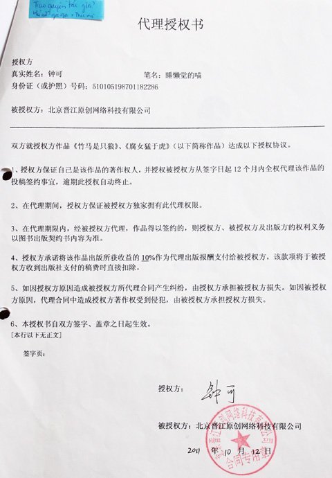 Đại diện phía Đinh Tị trong nỗ lực giành lại bản quyền phát hành cuốn sách này đã đưa ra Hợp đồng bản quyền kèm theo giấy uỷ quyền có chữ kí của tác giả Shuilan Jiao De Miao viết ngày 12/10/2011. Văn bản cho biết, tác giả đã kí độc quyền với đơn vị Công ty TNHH Khoa học Kỹ thuật mạng Tấn Giang kể trên, có hiệu lực trong vòng 12 tháng. Như vậy có nghĩa là Công ty TNHH Khoa học Kỹ thuật mạng Tấn Giang là đơn vị duy nhất được phát hành và bán bản quyền cuốn sách ra nước ngoài, cụ thể là Việt Nam - và công ty Đinh Tị là đơn vị duy nhất tại VN được phép phát hành cuốn sách trong khoảng thời gian này.