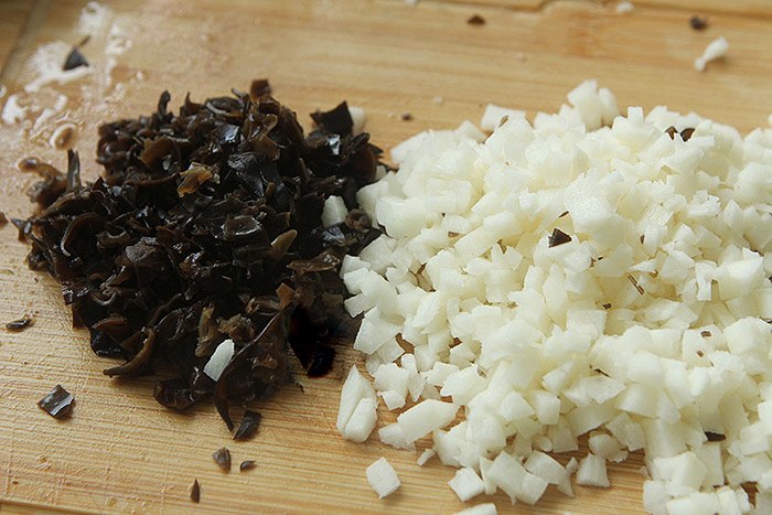 Mộc nhĩ ngâm với nước ấm cho nở mềm, rửa sạch, thái nhỏ. Củ đậu bóc vỏ, rửa sạch, băm nhỏ.