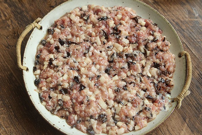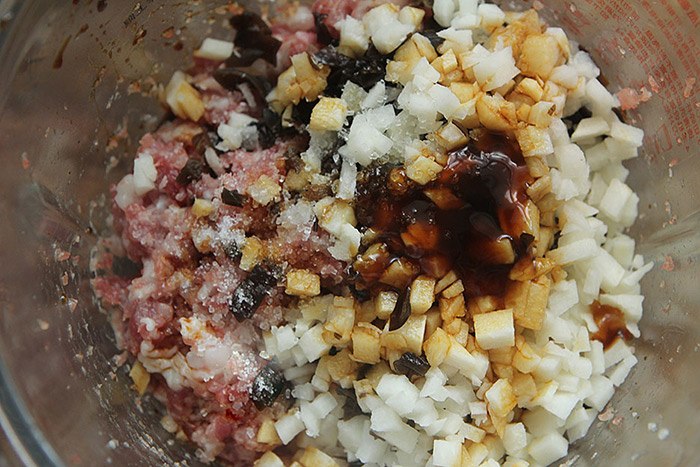 Cho mộc nhĩ, củ đậu vào thịt băm, thêm nước tương (hoặc nước mắm vừa miệng), dầu hào rồi đảo đều.