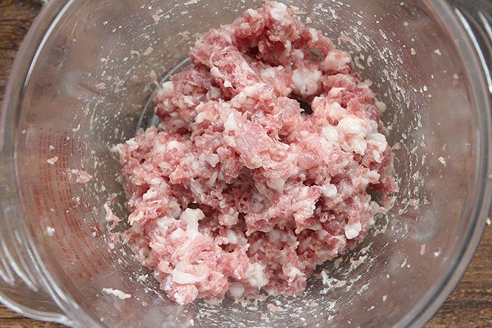 Thịt rửa sạch, thái nhỏ rồi băm nhỏ hoặc cho vào máy xay, xay nhỏ (không xay nhuyễn).