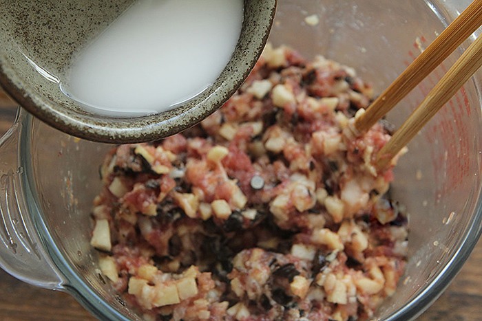 Lúc này thêm nước tinh bột vào, nhưng vừa cho từ từ nước tinh bột, vừa khuấy đều theo chiều kim đông hồ cho đến khi nước tinh bột ngấm hết vào thịt.
