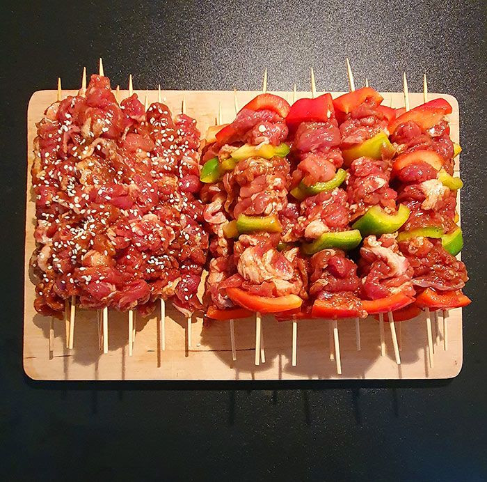 Ớt chuông cắt vuông quân cờ. Xiên thịt vào từng que xem kẽ ớt chuông và thịt.