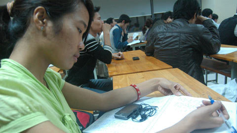 | Cô bạn này khá chăm chú với việc ghi chép. Đây là lớp học tại chức của các sinh viên mới ra trường thi vào.(Ảnh chụp tại các lớp học tại chức Trường ĐH Ngoại thương Hà Nội, tối ngày 13/12/2010). Văn Chung |