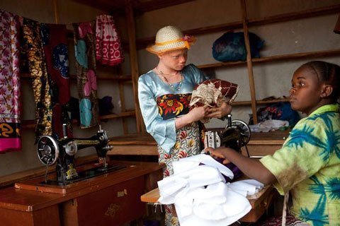 Angel Salvatory đang mua vải tại chợ trong làng Kabanga. Ngoài nguy cơ bị săn bắt ngoài đường, những người bạch tạng Tanzania cũng phải bảo vệ bản thân trước ánh nắng Mặt trời. Họ rất dễ bị sạm nắng và ung thư da – nguyên nhân cướp đi sinh mạng của khoảng 98% số người bạch tạng ở quốc gia này.