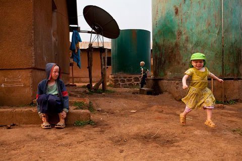 Ferista Daudi (phải) vui đùa tung tăng quanh khu Trung tâm bảo trợ Kabanga. Cô bé 2 tuổi này đã phải rời bỏ làng của mình sau khi một thầy phù thủy giết chết mẹ của em để đánh cắp các bộ phận cơ thể.