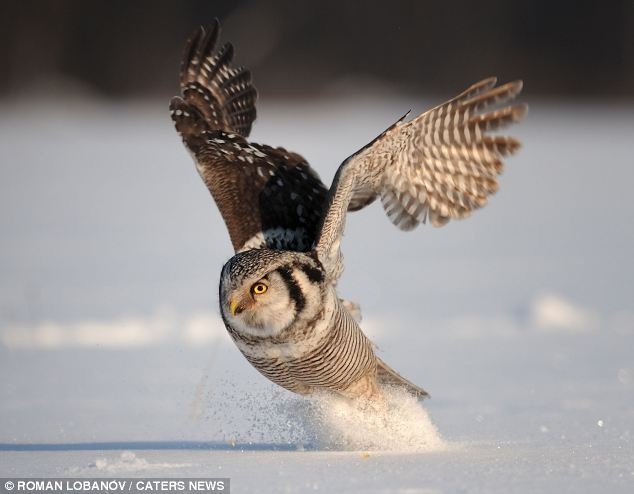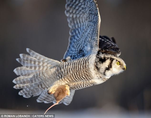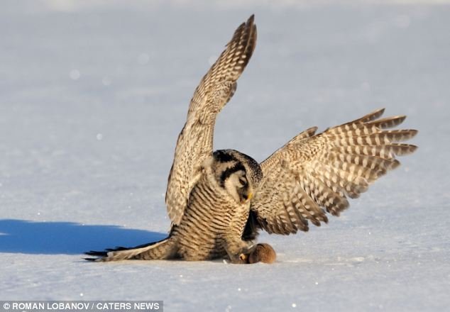 Trong khi đang bay tìm kiếm thức ăn trên bầu trời ở Rybinsk (Nga), con chim cú đuôi ó với cái bụng đói meo đã bất ngờ phát hiện thấy một con chuột nhỏ đang chạy trên tuyết. Chim cú ngay lập tức xà xuống và săn đuổi con mồi.