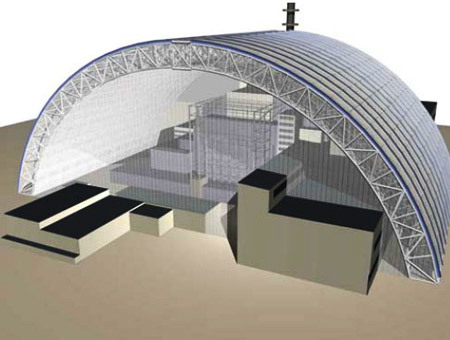 Một công trình vùi lấp sẽ có dạng vòm cuốn, cao 105 mét, “mọc lên” trên 4 hình khối của nhà máy điện hạt nhân Chernobyl đã đi vào lịch sử với sự cố kinh hoàng năm 1986.