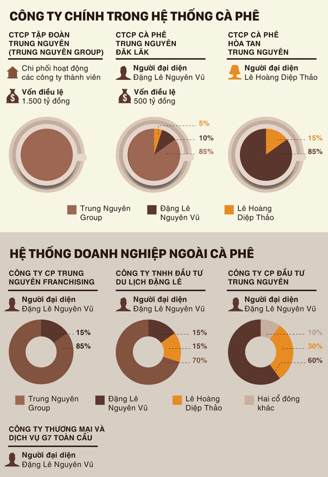 Công ty trung tâm trong hệ thống Trung Nguyên là Công ty CP Tập đoàn Trung Nguyên. Tại đây, ngoài ông Đặng Lê Nguyên Vũ nắm 20% cổ phần, bà Lê Hoàng Diệp Thảo nắm 10%, thì 70% còn lại thuộc về một pháp nhân khác. Pháp nhân này được xác định là Công ty cổ phần Đầu tư Trung Nguyên (Trung Nguyên Investment), doanh nghiệp chi phối cổ phần của hầu hết đơn vị thành viên tập đoàn, trong đó bao gồm cả quyền sở hữu trí tuệ tất cả nhãn hiệu.