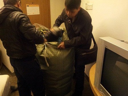 | Anh "tai" Lục cùng nhân viên đóng bao đang hì hục đóng bao hàng của Tâm ngay tại phòng khách sạn. |