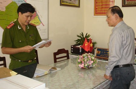 | Đại diện Cơ quan CSĐT tống đạt quyết định khởi tố bị can, cho tại ngoại đối với ông Nguyễn Hồng Quân. |