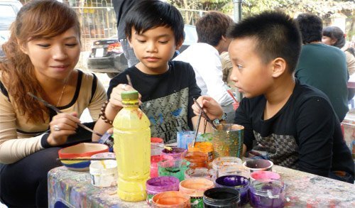 Chị Đinh Thu Ngân, 47 Văn Cao, Hà Nội, cho hay, tô màu là sở trường của trẻ em. Bình thường các em tô trên giấy, trên bảng, tô ở công viên, lớp học, nhưng hôm nay được tô trên tượng gốm ở Bát Tràng.