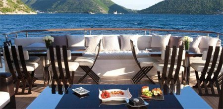 | Một nơi thư giãn ngay phía trước buồng lái của du thuyền. |