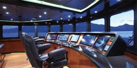 | Khoang lái với cửa sổ lớn và ba chiếc ghế lớn dành cho thuyền trưởng và các phụ lái. |