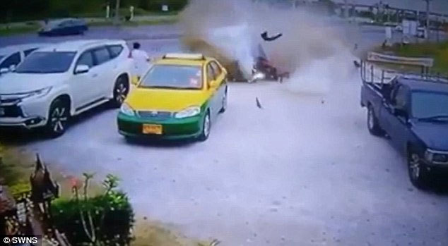 Tài xế taxi trên vừa dùng xong bữa sáng tại cửa hàng ven đường ở Nonthaburi, Thái Lan sáng 16/12. Anh đã cố chạy thoát thân, nhưng không kịp. Sau cú va chạm, toàn bộ khu vực phủ đầy khói bụi màu trắng.